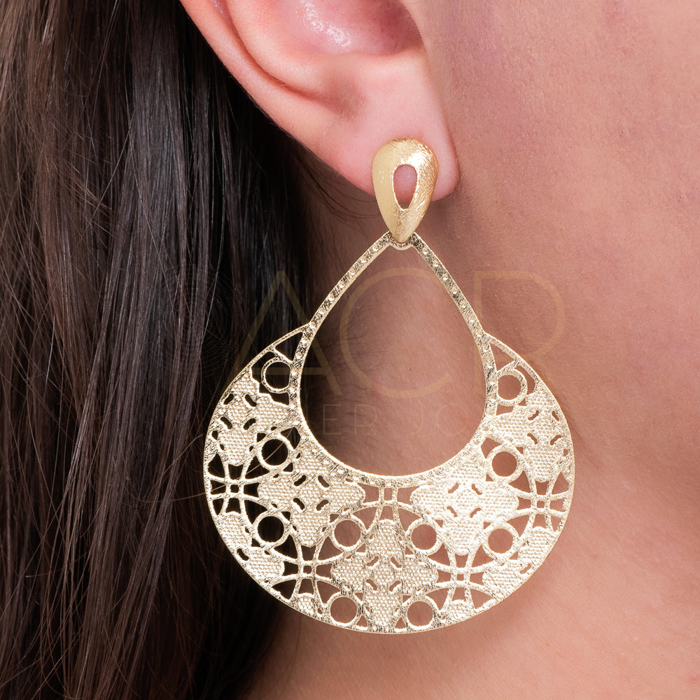 Aro baño de oro, modelo gota satinada con diseños en su interior, tamaño grande.