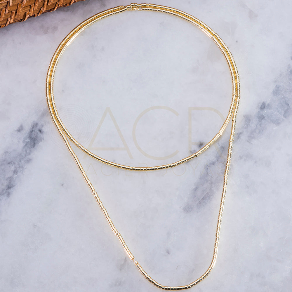 Cadena baño de oro mini mostacilla lisa. Mide 50 cm de largo con 5 cm de alargue. Esta cadena la conforman mini mostacillas lisas. Su textura es suave, cada una de las mostacillas son lisas lo que le da un acabado brillante perfecto.